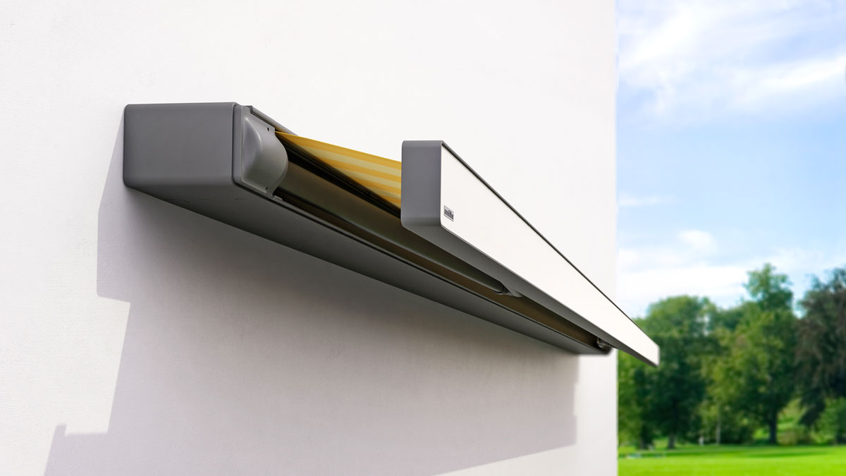 Diese praktische eckige Markise eignet sich perfekt für den Einbau unter Vorbauten oder in Nischen - je nach Bausituation verschwindet das glatte Ausfallprofil vollständig in der Wand oder liegt bündig mit der Fassade.